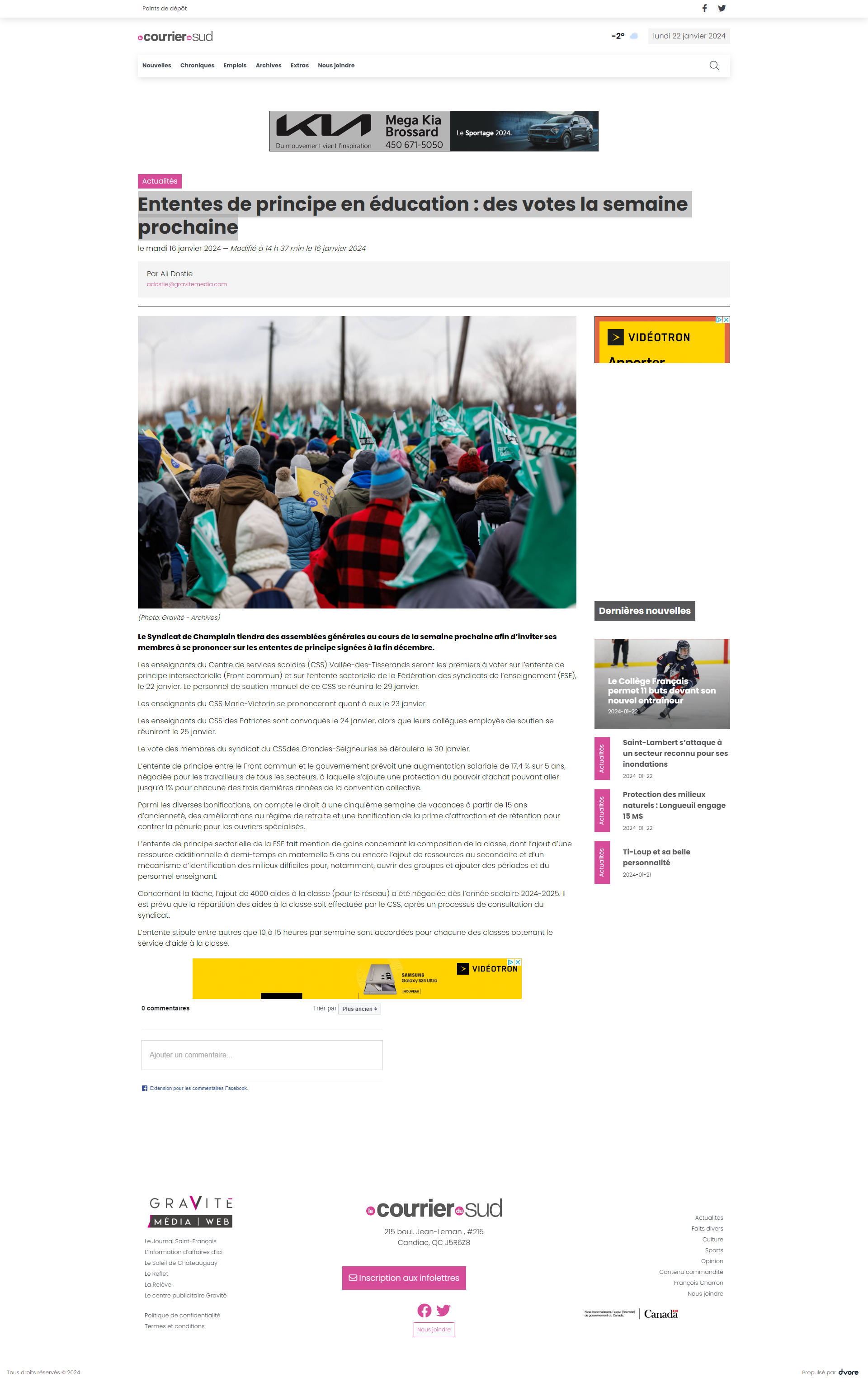 Ententes de principe en éducation : des votes la semaine prochaine 22 janvier 2024 2024-01-16 – Courrier du Sud – Ententes de principes en éducation: des votes la semaine prochaine